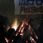 Mark and I were in our raggedy house clothes, relaxing on the couch watching the Cátalan TV3 news, commenting on the footage they were showing of bonfires and devils spitting fire, when we suddenly realized the action was taking place right here in Gracia in a Plaça about 4 blocks from our house! Wow! Looks exciting! … We threw on our street clothes and headed to Plaça Virreina. As soon as we stepped onto the street we could feel the buzz in the air, with families with little kids scurrying towards the action. We could hear marching drums getting louder and louder until we overcame the parade heading towards Plaça Virreina. The parade was extremely chaotic yet well organized, with people setting off fireworks at the back end. We took a shortcut in order to bypass the noisy confusion and were rewarded at Plaça Reina, for we made it there just in time for the action. There was already a huge bonfire going in front of the church at the plaça.