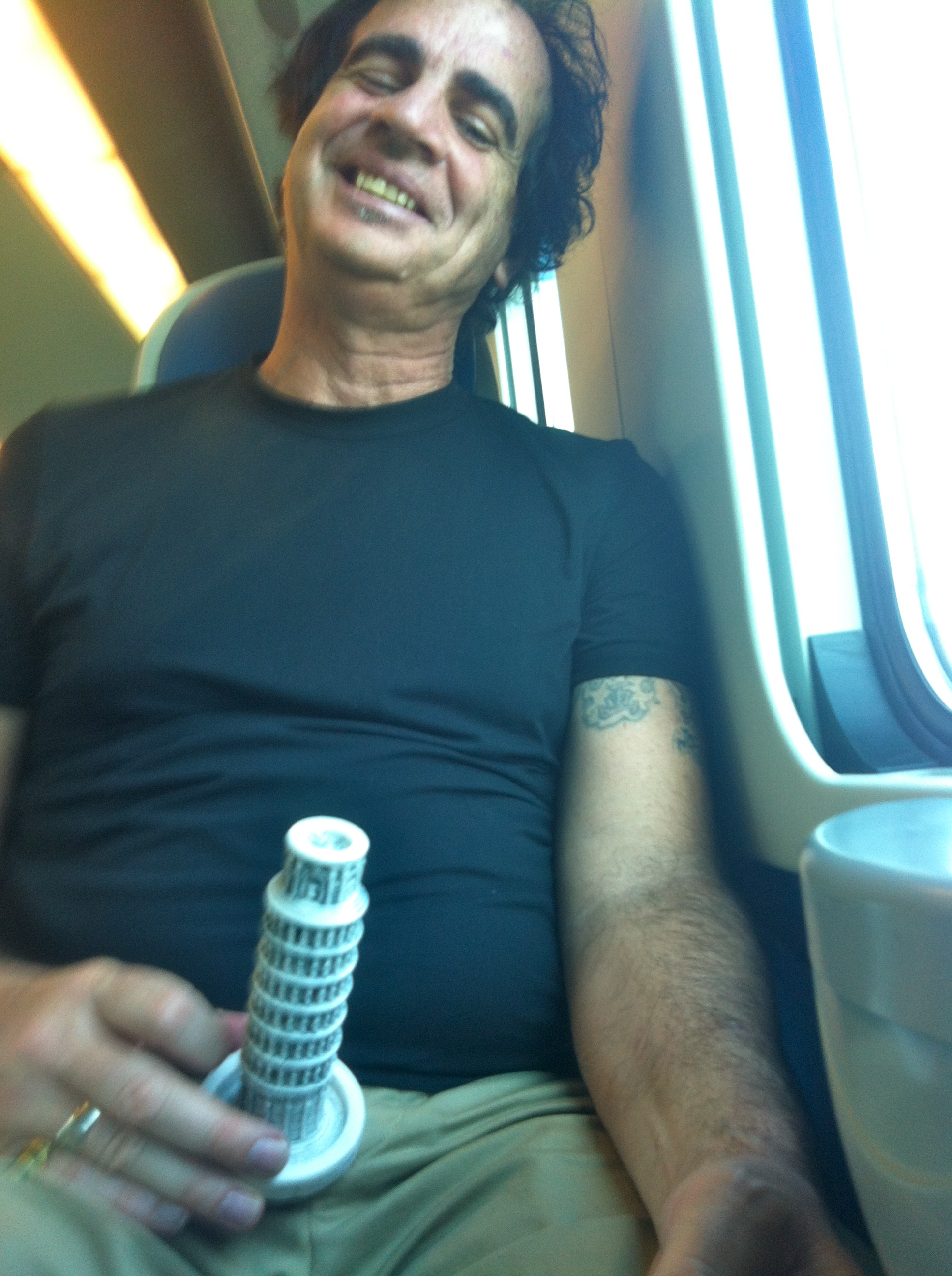 And now for some real silliness; Mark bought a souvenir plastic leaning tower, which I had fun photographing on the train ride back to Florence. Hopefully he won’t object to their being included in this blog: